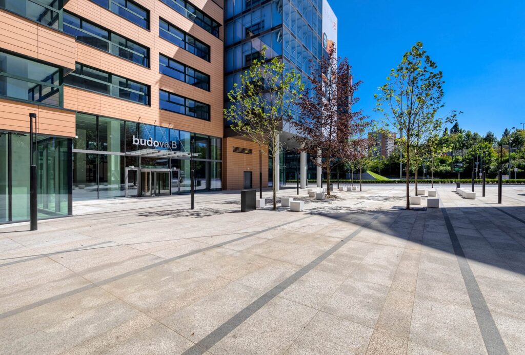 The adjacent public space was also improved during the reconstruction. A new square, náměstí Ellen G. Whiteové, was created in front of the main entrance to the building, with mature trees and benches and secure bicycle stands. A water jet fountain with coloured lights is also an item of interest. The open atrium/inner courtyard of the building, which offers another relaxation space for the tenants and the general public, also has a brand-new appearance. It is possible to use the nearby reconstructed footbridge over Vyskočilova Street in the direction of Brumlovka Square. The total investment into the reconstruction and the improvement of the public space reached CZK 470 million.