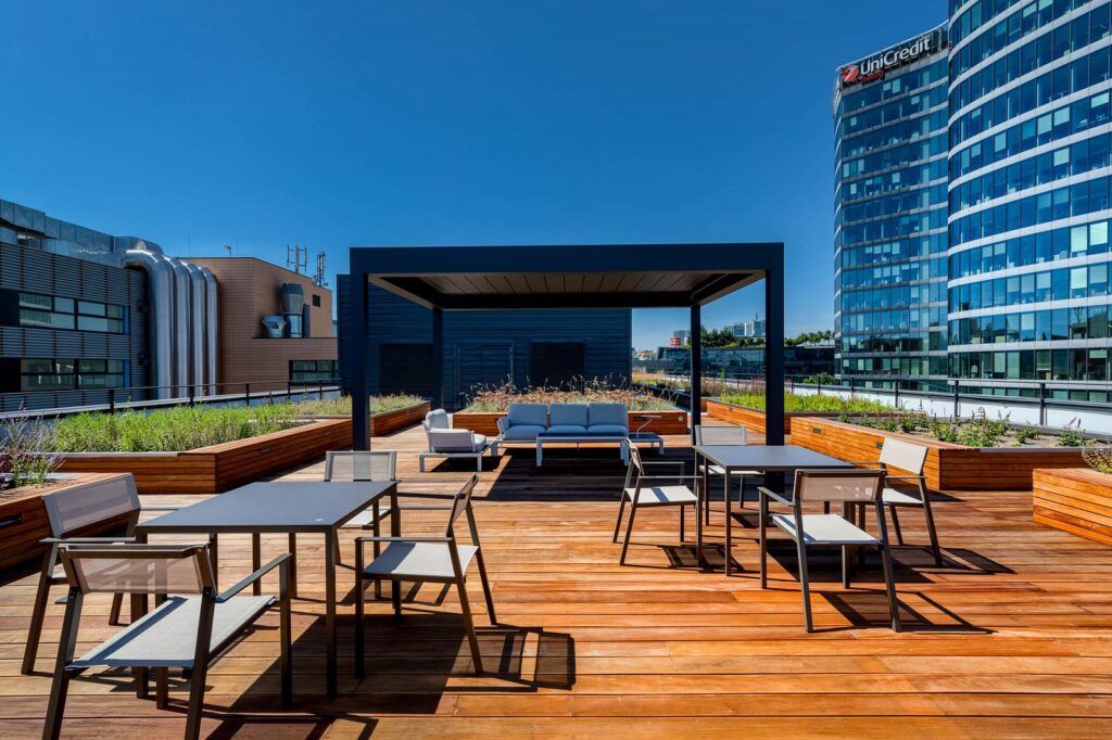 The outer appearance and the interior layout of the building were modernised as part of the reconstruction. The building has a new façade in earthy tones, with glass being chosen as one of the essential materials, giving the entire building airiness while simultaneously ensuring ideal light conditions inside. All the technologies providing a comfortable working environment also underwent modernisation, with an emphasis on efficiency and economic operations. The building offers a total of 15,600 m2 of leasable space on eight storeys, an underground garage and also an expansive rooftop terrace with greenery available for the tenants. The author of the reconstruction is the architecture studio A8000 and GRIMM Architekti, the investor the PASSERINVEST concern.