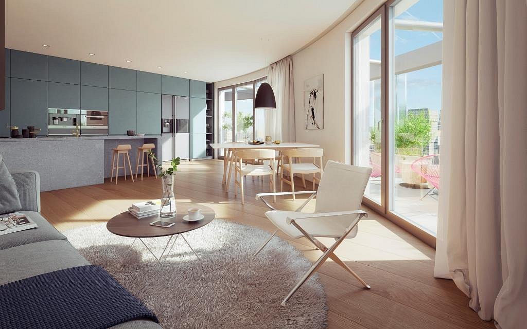 The new compactly-conceived building offers modern housing in a locality with full civic amenities and wonderful transportation accessibility, as well as an abundance of peace and privacy thanks to the parks and surrounding greenery. The architectural design by the atelier A69 – architekti evokes the shape of an olive, according to which the building got its name. The heart of the building will be a grand atrium with greenery, a glass roof and panoramic lifts, which also create a natural meeting space for the building’s inhabitants.