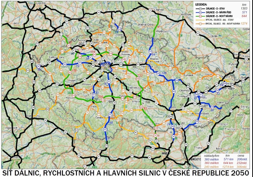 Navržená koncepce svým pojetím dobudování 644 km dálnic a 1 274 km rychlostních silnic (viz Map. 1) a zefektivněním sítě metra v Praze včetně jeho propojení s příměstskou železnicí (viz Map. 2) výrazně přispěje k rozvoji regionů, odstranění dopravního přetížení Prahy i okolí a posílení výkonu celé ekonomiky ČR.