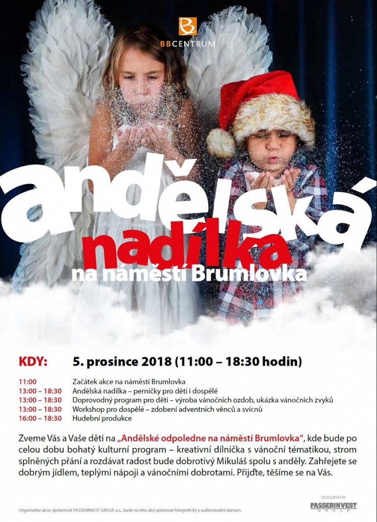 Následující týden, ve středu 5. prosince, se všichni návštěvníci BB Centra mohou těšit na andělskou nadílku. Od 13 hodin bude Mikuláš spolu s anděly na náměstí Brumlovka rozdávat perníčky. Připraven je bohatý doprovodný program pro děti i dospělé, kteří si budou moci vyrobit vánoční ozdoby, odekorovat adventní věnec nebo vytvořit tematický svícen. K dispozici budou stánky s občerstvením a dojde i na poslech hudby.
